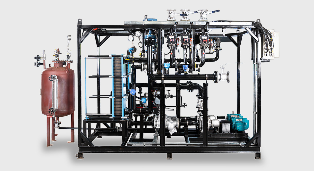 These heat transfer skids are comprised of HRS range of heat exchangers (shell and tube heat exchangers or plate heat exchangers or a combination of these and any other heat exchangers as suited to the process) along with pumps, valves and suitable automation for ease of operation.